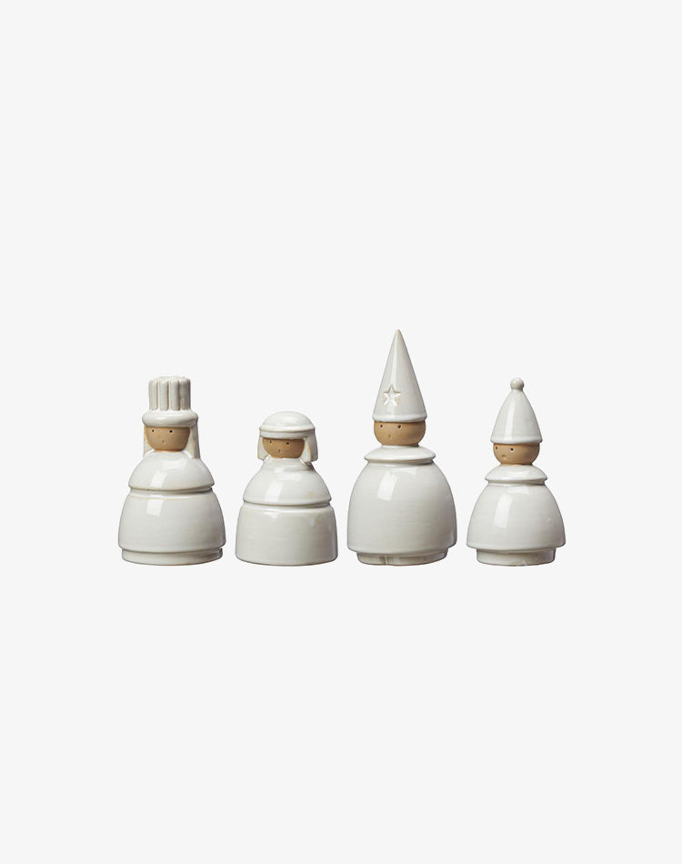 These delightful "Christmas Procession" figurines are a charming ensemble that encapsulates the essence of the season in a whimsical Scandinavian style. This comprises four individual endearing, rounded white characters, each exuding its own unique charm. Crafted from stoneware and measuring 8 x 13 cm, 7 x 11 cm, 7 x 16 cm, and 7 x 13 cm, these figures are perfect for adding a touch of holiday magic to your décor.