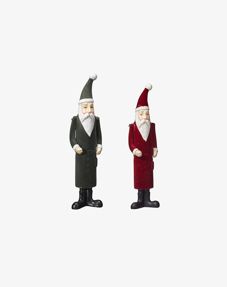 Crafted from durable polyresin, Santa is dressed in a long green jacket and a tall hat, exuding classic holiday charm with a touch of Scandinavian style. The perfect accent for any Christmas décor theme.